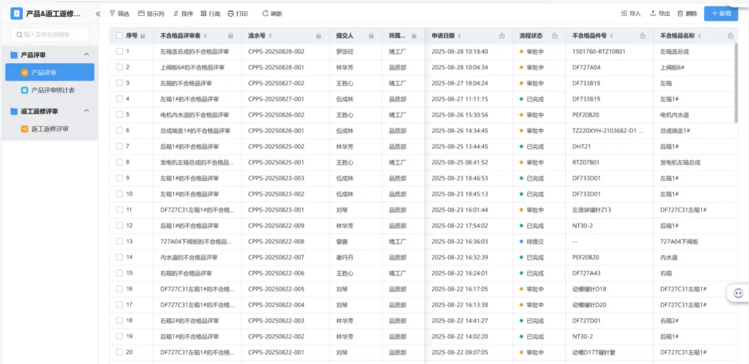 此前,产品与返工返修评审流程完全依赖线下纸质表单流转,不仅传递效率低、易丢失,版本也难以统一,查询、跟踪和统计数据都不方便。针对这一痛点,项目组通过云之家轻云平台,快速搭建了“产品/返工返修评审”电子化应用,将全流程迁移至线上,实现了从发起、审批、执行到归档的全生命周期数字化管理。