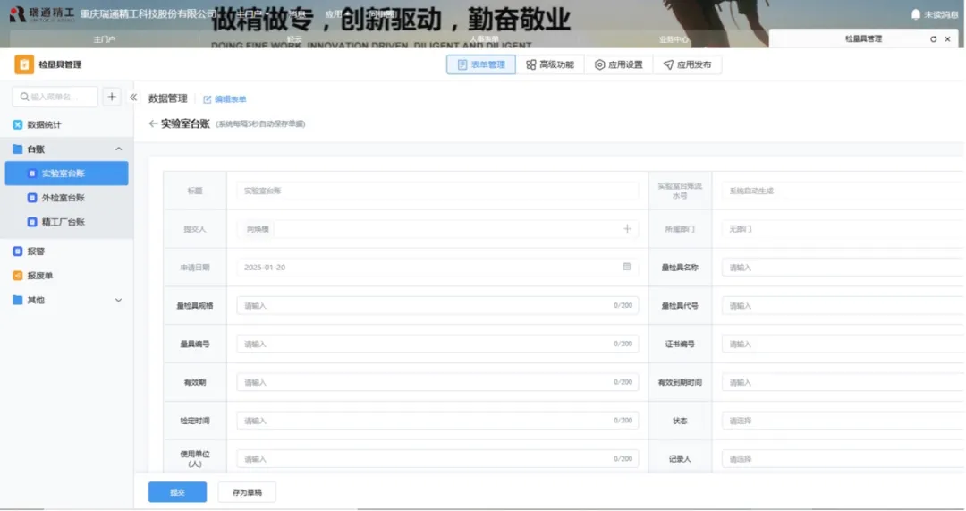 基于云之家轻云平台,瑞通精工快速搭建了涵盖检具量具管理、人事表单、产品/返工返修评审等业务应用。