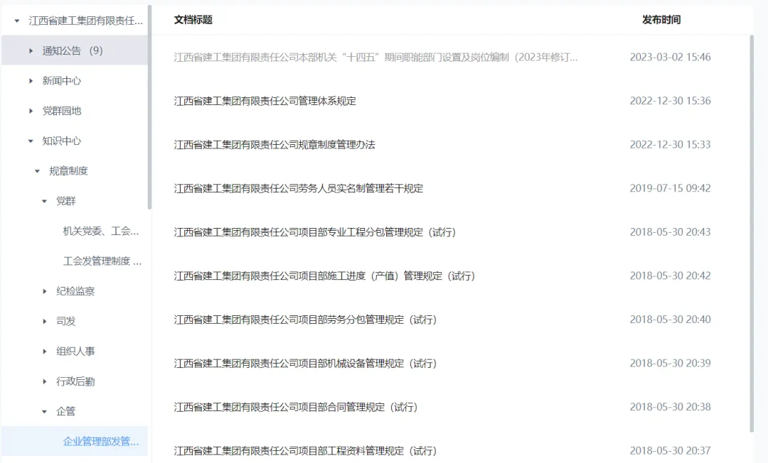 “江西建工云”实现了集团与子公司文档的集中管理,支持全员发布、分级审核、统一管控。目前已创建数百个知识目录,发布文档超1000条,已形成体系化的企业知识库。