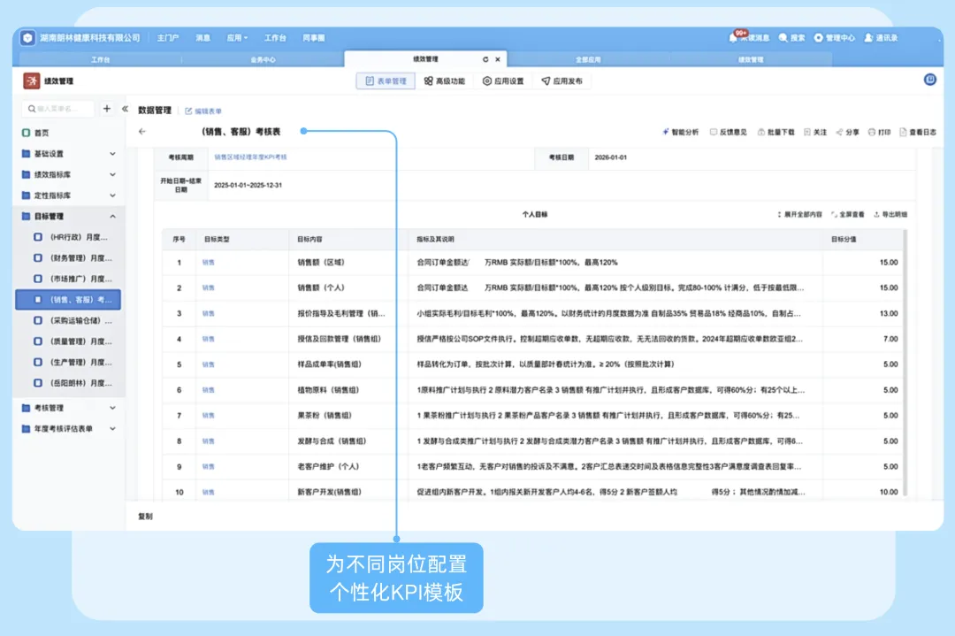通过场景可组装模块,为不同岗位配置个性化KPI模板: