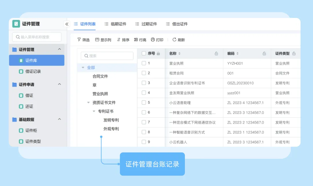 | 证件合规风险高:研发人员的执业药师证、企业的生产许可证等重要证件分散在各部门,缺乏统一管理。一方面,证件到期易被遗漏,存在超期失效风险;另一方面,证件借阅流程不规范,无记录易丢失,有导致项目延误风险。 | 证件管理全生命周期管控:通过云之家零代码平台的证件管理应用设置证件过期预警规则,实现证件风险提前提醒,实现自动化,保障企业运营安全合规性。 |